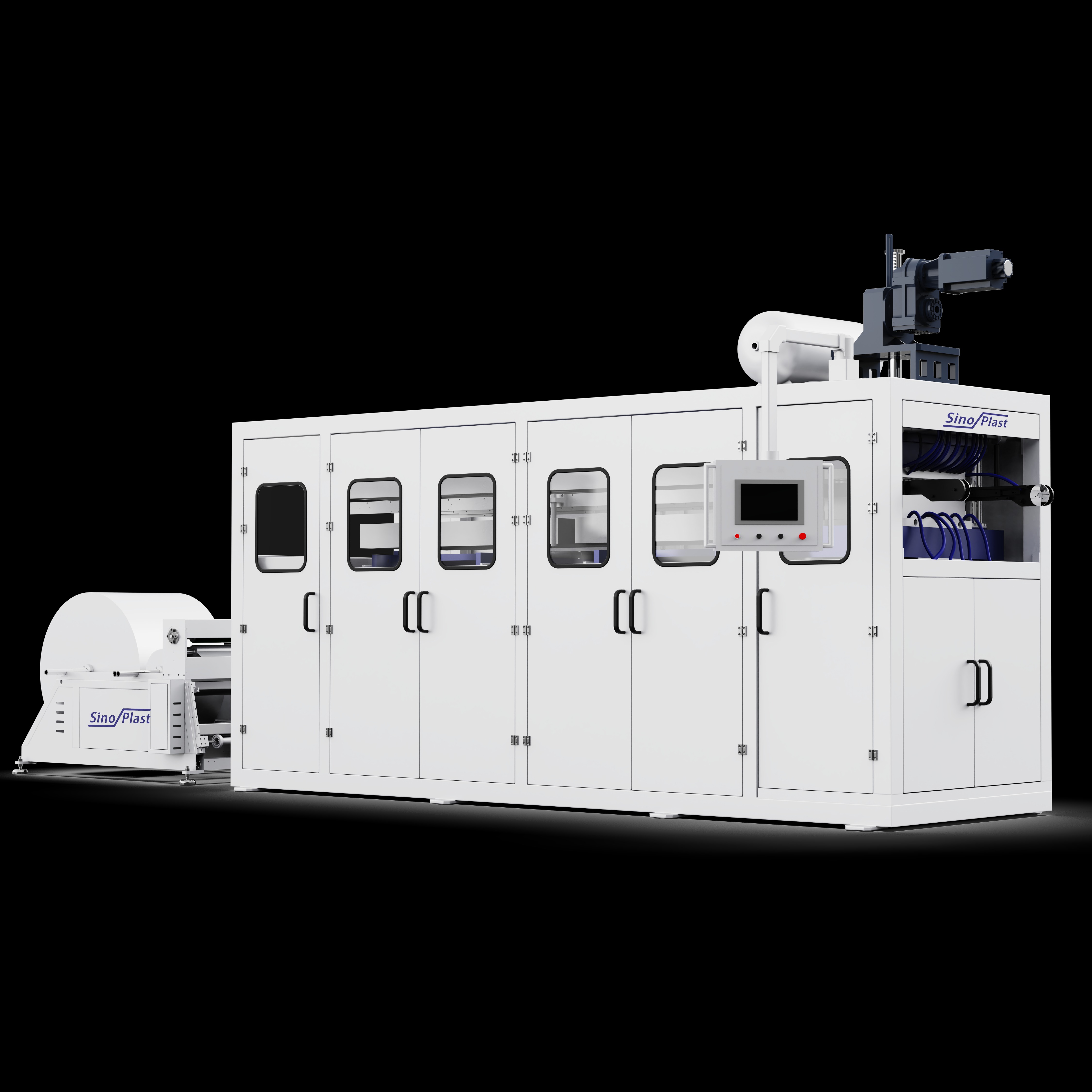 热成型多工位机器具有成型-切割-堆叠在线功能,主要用于制造用于食品包装或工业包装的不同种类的塑料包装,例如午餐盒、水果托盘、盘子、碗、盖子、泡罩包装机等,采用 PP/PS/EPS/PET/PVC 和可生物降解的热成型塑料片箔制成。