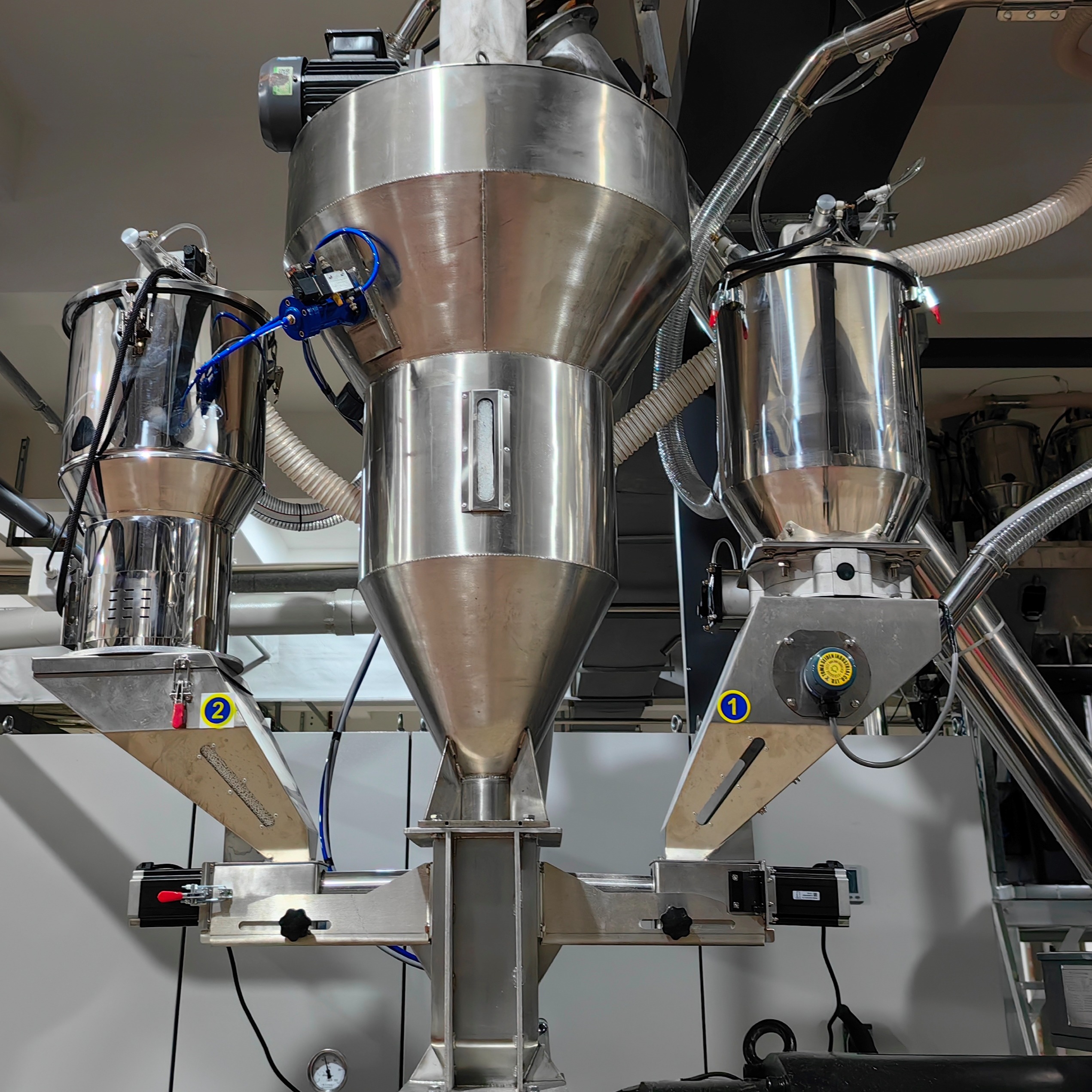 储料斗带有放料口,容易清理 彩色触摸屏,非常友好的人机界面 有手动放料按钮,清料非常容易 自动运行 物料通过重量计量 无需计算物料的比例 直接设定物料的重量比例即可 自动补偿物料的波动 不受冲击和震动影响 操作简单 容易进行清洁和换色生产