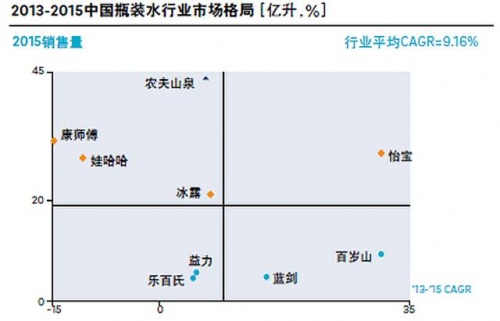 受新晋挑战者的冲击,传统瓶装水龙头企业节节败退,出现负增长。农夫山泉的优质水源核心卖点获得极大成功。怡宝和百岁山则抓准高端瓶装水细分市场机遇,迅速切入并获得快速增长。