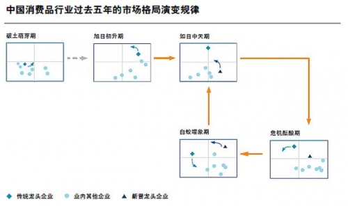 基于企业发展路径,对多个消费品细分市场全景的动态研究揭示了高度一致的运转规律:中国消费品行业的全景演进会历经“破土萌芽”、“旭日初升”、“如日中天”、“危机酝酿”和“白蚁噬象”五大阶段,此过程中将伴随着行业龙头的竞相更替。